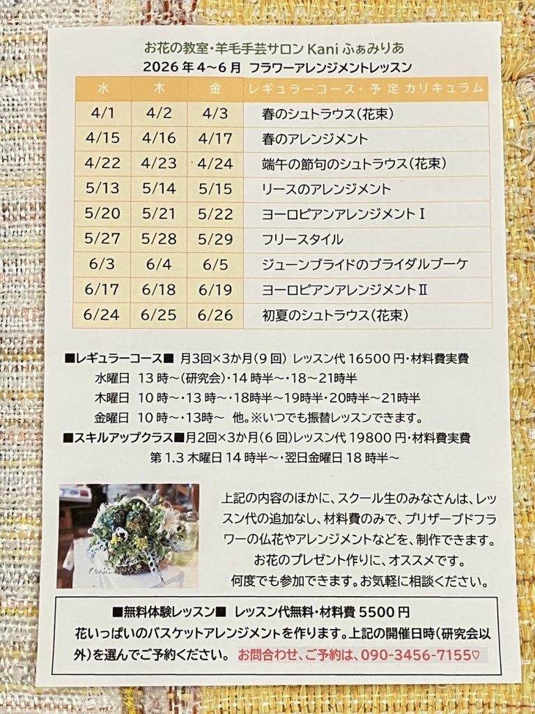 季節のお花を使ったフラワーアレンジメント、ブーケ、花束、スワッグ(壁飾り)、リース、コサージュなど、毎回違ったデザインを、幅広く気軽に楽しみます。現在のスケジュールはこちらです。3か月ごとにこのような予定表をお渡ししています。